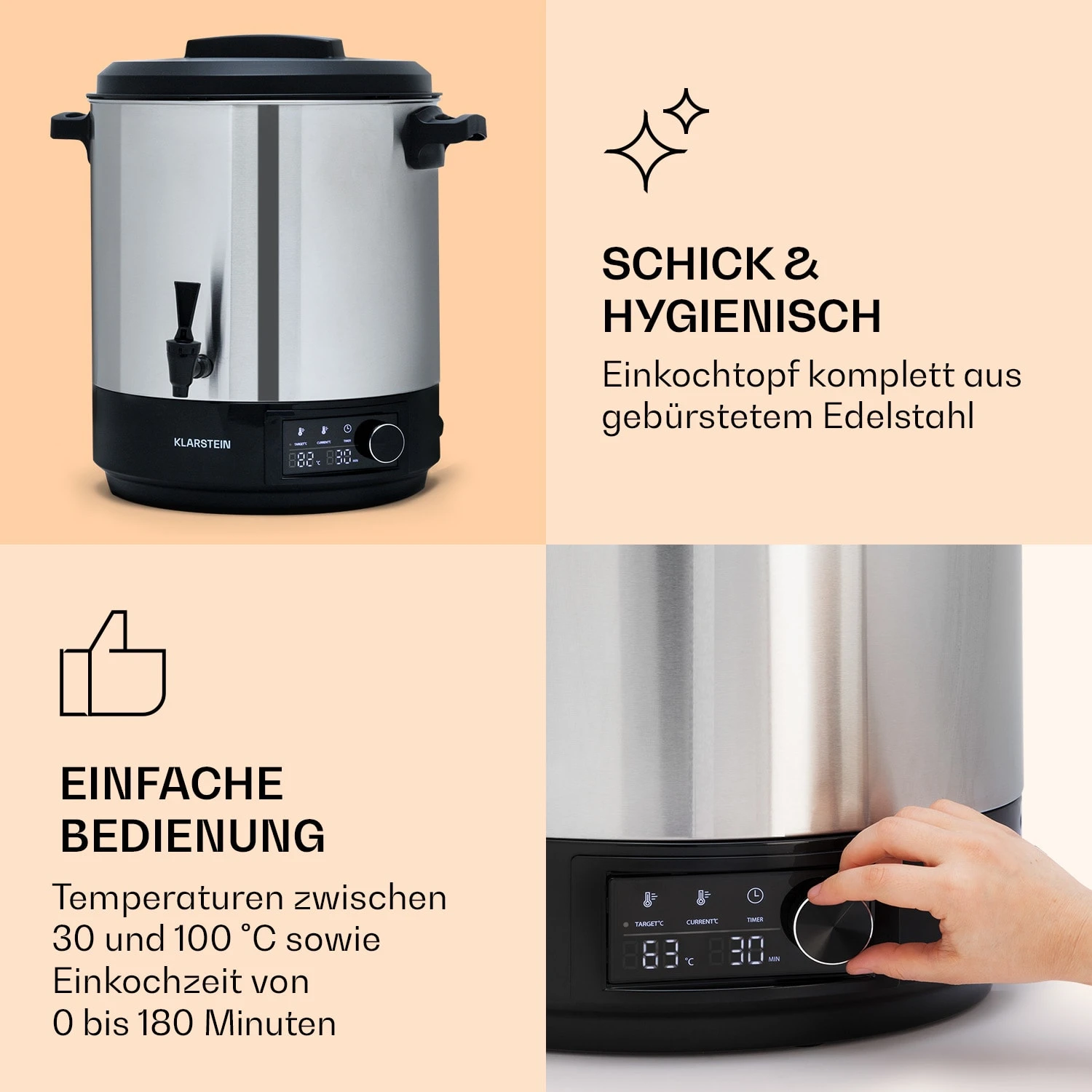 Einfache Bedienung: Temperaturen zwischen 30 und 100 °C sowie Einkochzeit von 0 bis 180 Minuten