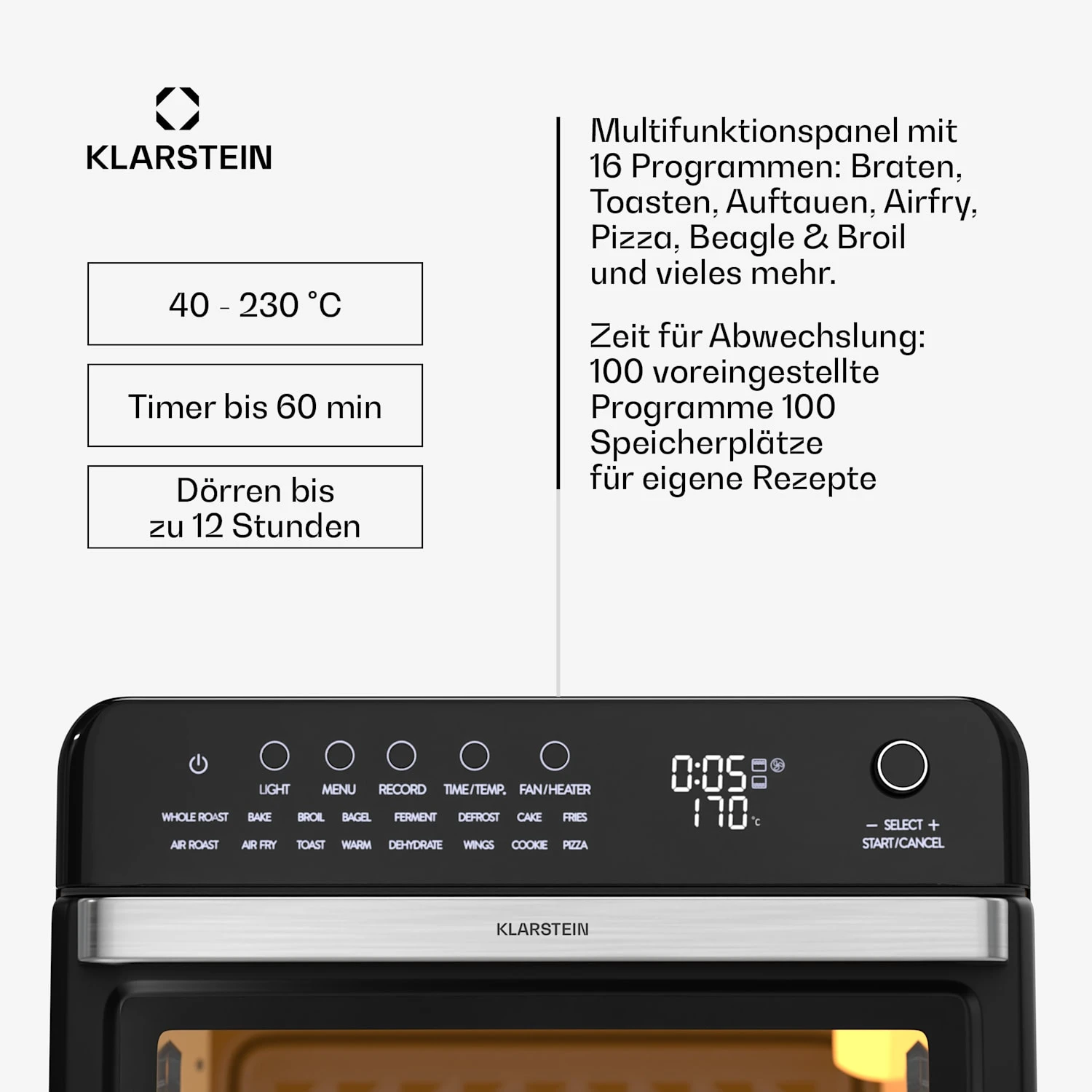 Programme: Whole Roast, Heißluft-Frittieren, Toasten, Rottisserie, Grillen, Backen, Bagel, Pizza, Warmhalten, Auftauen, Fermentieren, Dörren, Wings, Kuchen, Cookies und Pommes