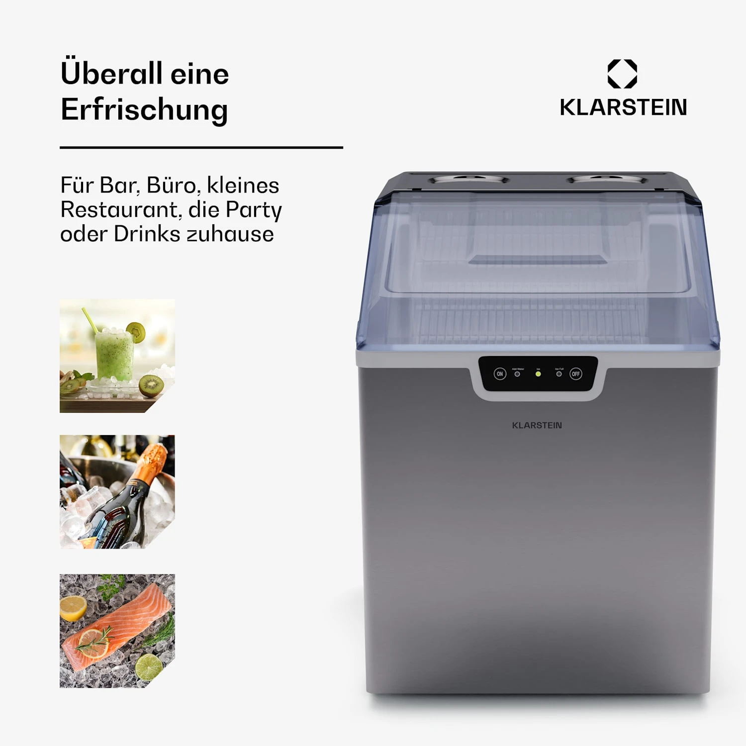 Der Klarstein Icefestival Eiswürfelbereiter versorgt mit seinem Hochleistungskompressor spielend einfach Bars, Restaurants, Veranstaltungen und Frischetheken mit den nötigen Eiswürfeln für kühle Getränke oder zur Kühlung von Lebensmitteln.