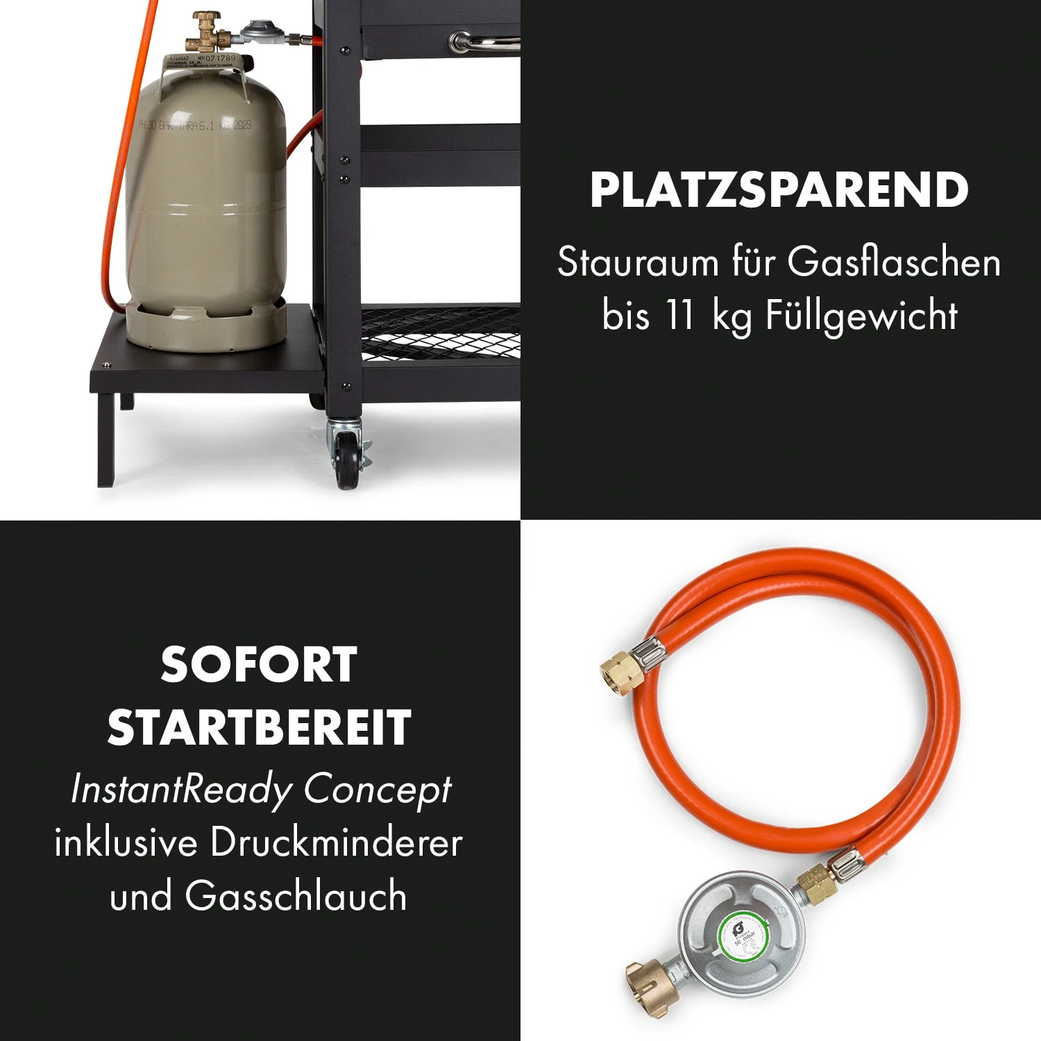Nach dem Anschluss einer Gasflasche sorgt die Piezo-Zündung dank SNAP-JET Ignition-System für den schnellen Start eines Brenners: Das Drücken eines Drehknopfes genügt, schon ist der Gasgrill betriebsbereit. Die leistungsstarke Hitze der drei Haupt- und einem Seitenbrenner aus Edelstahl mit einer enormen Gesamtleistung von 13,5 kW sorgt dafür, dass verschiedenste Speisen außergewöhnlich gut gegrillt werden. Auf den beiden gusseisernen Grillrosten mit einer enormen Größe von jeweils 53 x 45 cm werden besonders Steaks und andere Fleischspezialitäten hervorragend auf den Punkt zubereitet: Durch die hohen Temperaturen gelingt das Fleisch außen kross und innen zart und saftig. Die Hitze wird dank der doppelwandigen Deckel aus Edelstahl besonders gut im Innern gehalten, zwei Thermometer geben jederzeit Auskunft über die aktuellen Temperaturen.