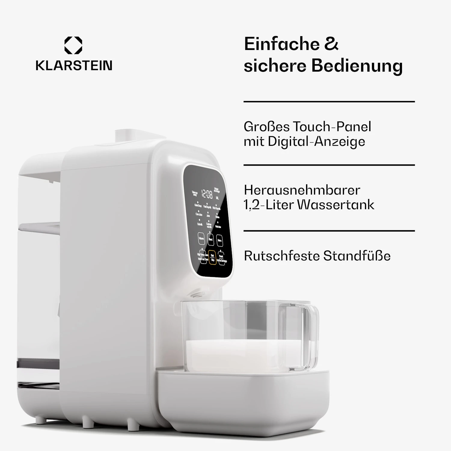 Höchste Leistung für hochwertige, vegane Drinks und mehr: Der Klarstein Loire 4 in 1 Vegan Drink Maker ist dein Küchenhelfer für jeden Tag. Dank seiner 4-in-1 Funktion stellt er für dich in Windeseile vegane Milchalternativen, Babynahrung und mehr her. Du kannst ihn als kraftvollen Mixer und Food Processor verwenden. Durch die schnelle Erhitzung mit 1200 Watt und den Motor mit 800 Watt geht die Zubereitung sämtlicher Drinks, Säfte und Pürees schnell und einfach von der Hand. Sein hochwertiges Mahlwerk mit 4 Klingen zaubert aus den Zutaten die feine Basis für Drinks. Besonders für Veganer und Menschen mit Laktoseintoleranz ist der hochwertige Klarstein Loire Mixer der Hit: Ganz einfach kannst du Soja- oder Nussdrinks selbst herstellen!