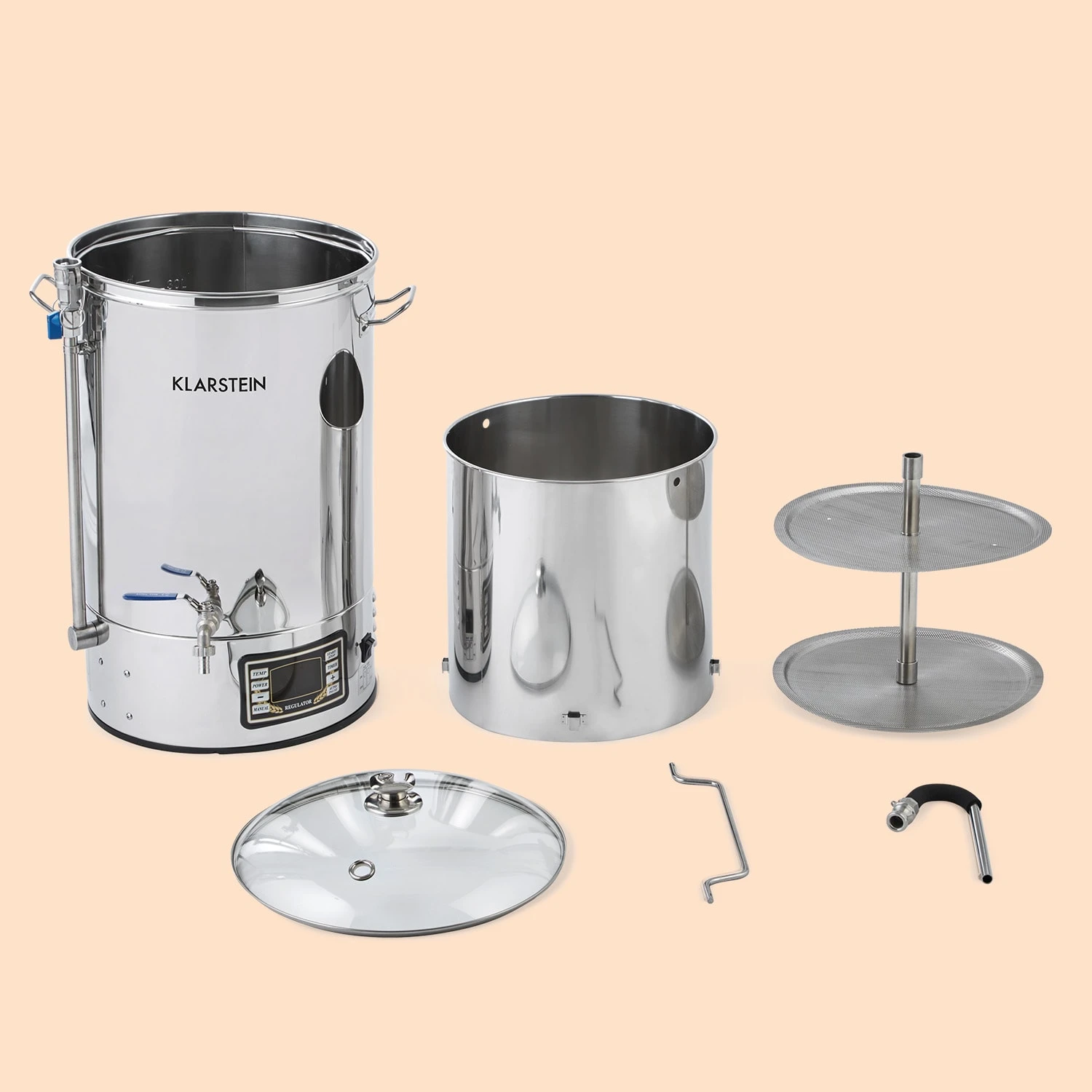 Ob hell oder dunkel, ober- oder untergärig, Weizen oder Pils, der Klarstein Mundschenk Maischekessel ist ein Bierbrau-Komplettpaket – damit erhält Selbstgebrautes die richtige Stammwürze. Über ein übersichtliches LC-Display mit Kontrollknöpfen kannst du Temperatur, Kochzeit und Leistung genau einstellen oder du übergibst den ganzen Prozess der MemoryBrew-Automatiksteuerung.