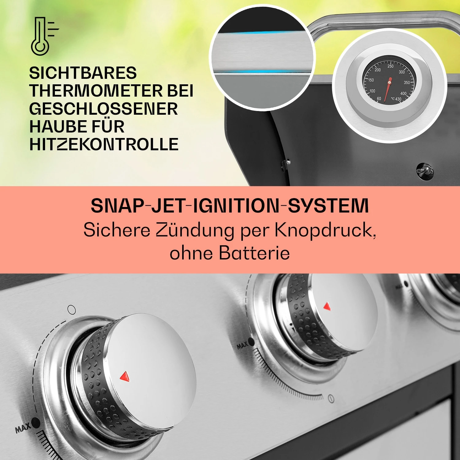 - doppelwandige Haube aus Edelstahl für indirektes Grillen