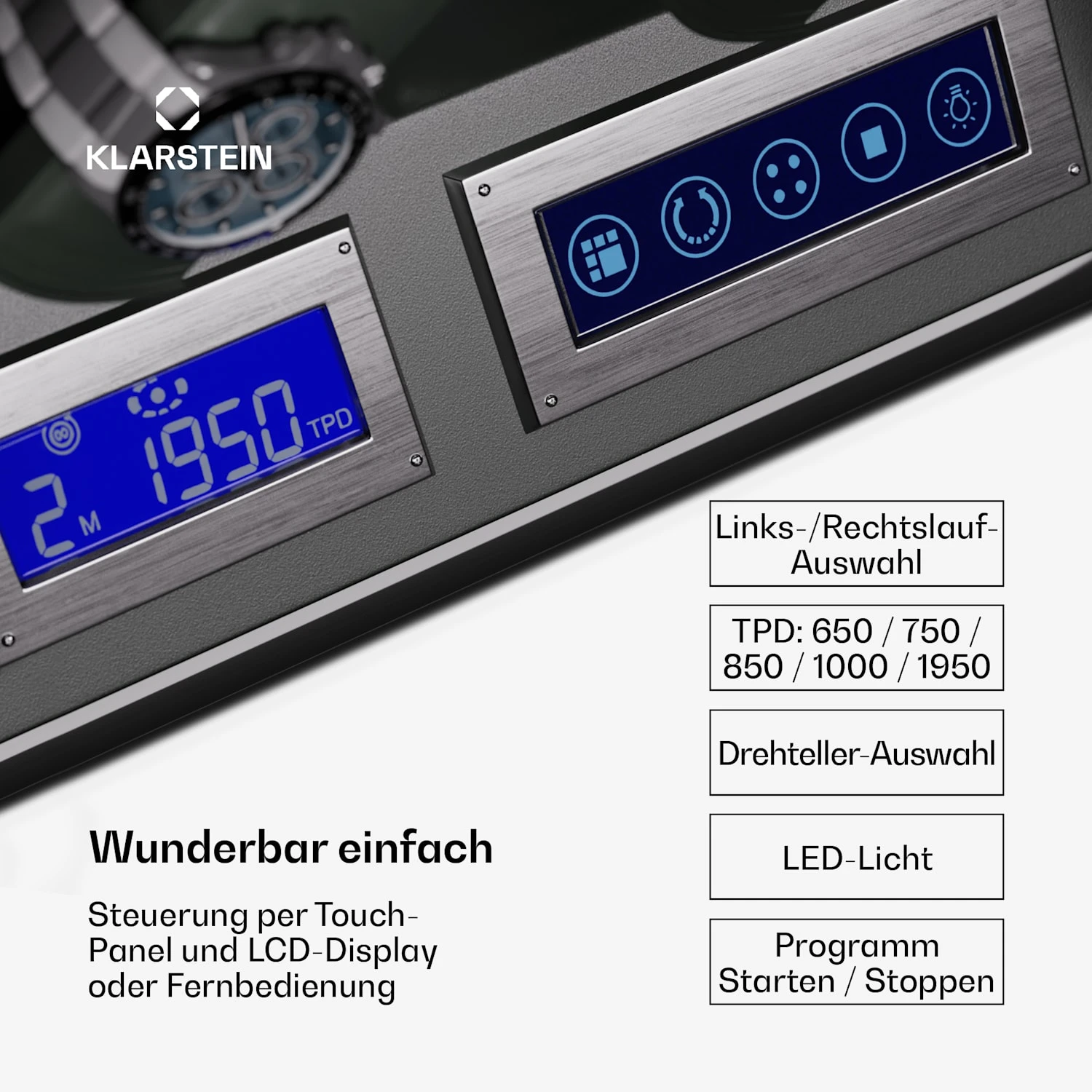 - 5 Drehgeschwindigkeiten: 650, 750, 850, 1000, 1950 Umdrehungen am Tag
