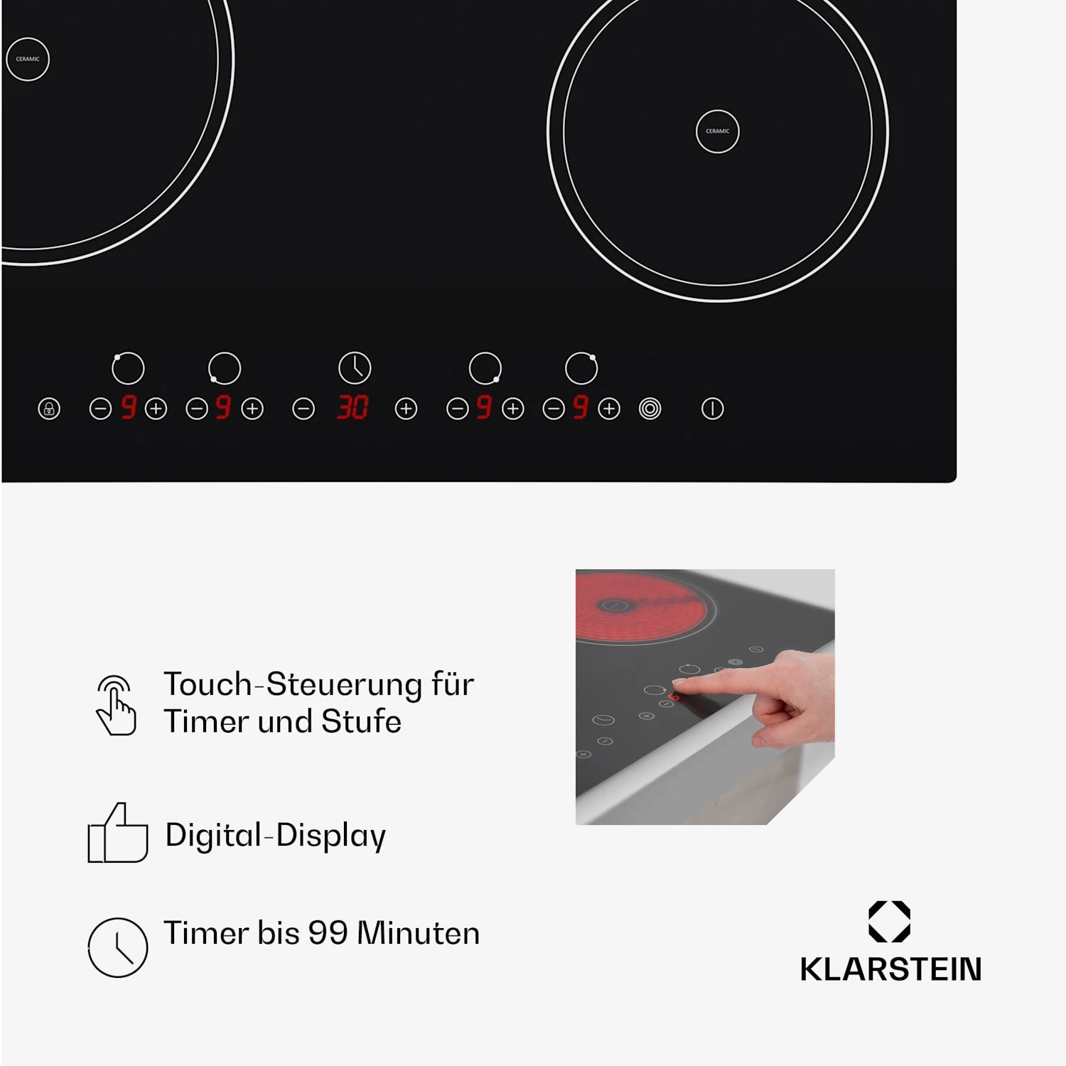 zwei Kochfelder mit 1200 W, eines mit 1800 W sowie ein Variokochfeld mit 800, 1600 oder 2300 W, separat regelbar in 9 Temperaturstufen